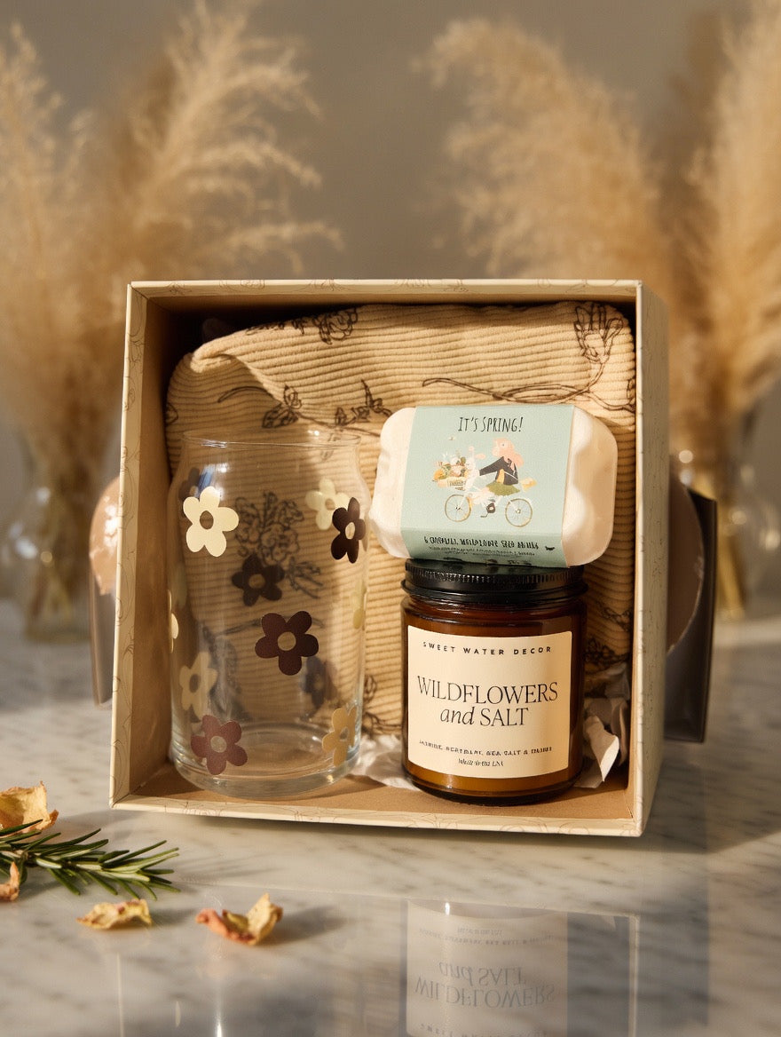 • A soothing wildflower candle — hand-poured with the soft, uplifting scent of blooming meadows to fill the air with springtime calm.